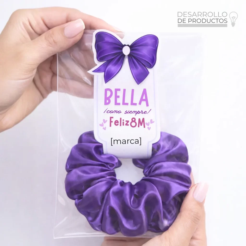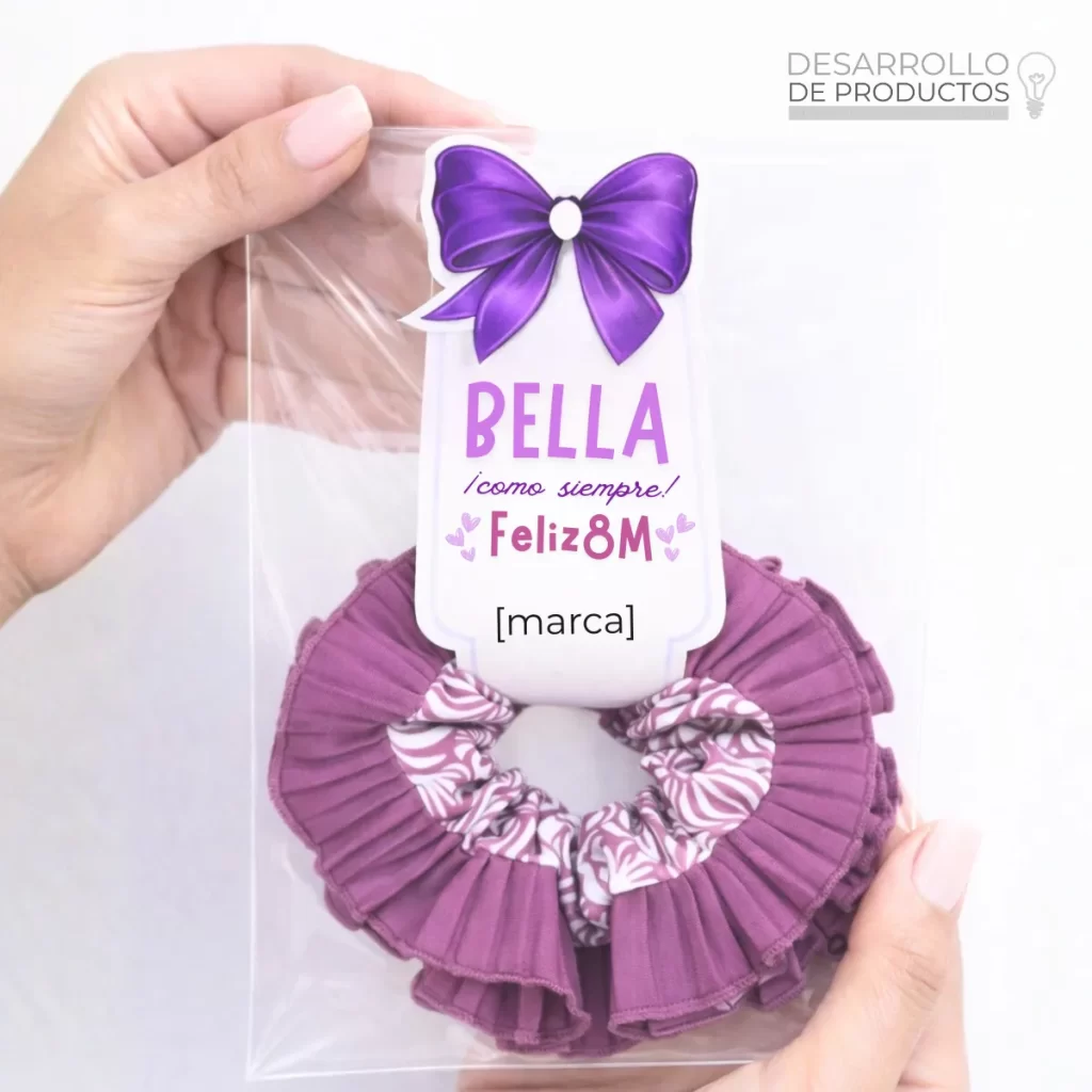 Un scrunchie de tela con diseño, un bello accesorio funcional, en una presentación original, diseñado con un saludo del día de la mujer, va unido a un fleje de papel. Diseño personalizado.