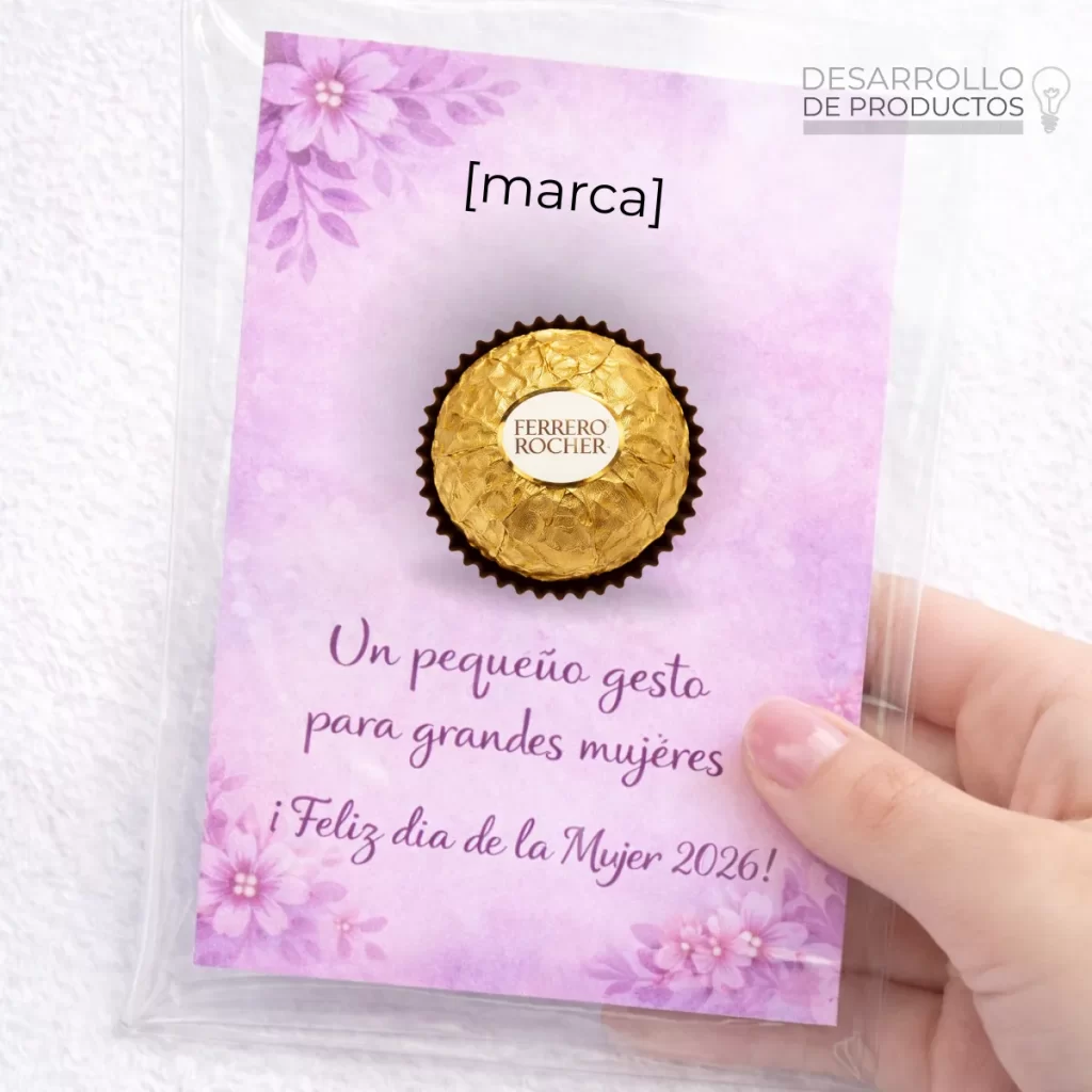 Un detalle dulce en una presentación original, diseñado con un saludo del día de la mujer, va pegado sobre una tarjeta. Chocolate o caramelo fino. Diseño personalizado.