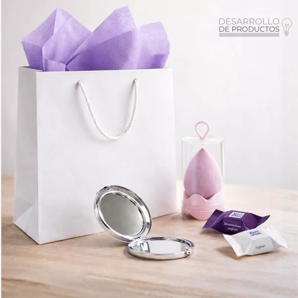 Set de regalo con estilo y detalle. Incluye esponja de maquillaje en estuche transparente con gancho, espejo metálico de acero inoxidable con doble vista (normal y aumento), 2 chocolates mini Ritter Sport Cube y bolsa de regalo. Un obsequio práctico y dulce para acompañar momentos de autocuidado y reconocimiento.
