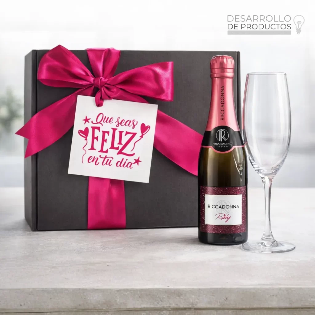Set de regalo elegante con espumante italiano Riccadonna Ruby (200 cc) y copa, presentado en caja con cinta y tarjeta personalizada. Un detalle ideal para celebrar logros y reconocer con estilo.