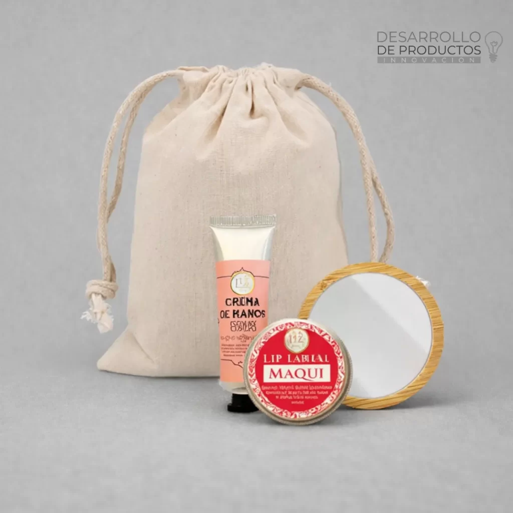 Pack regalo femenino con crema de manos y bálsamo labial de cosmética natural del sur de Chile, espejo de madera y saco de algodón natural. Un detalle delicado y consciente, disponible a pedido.